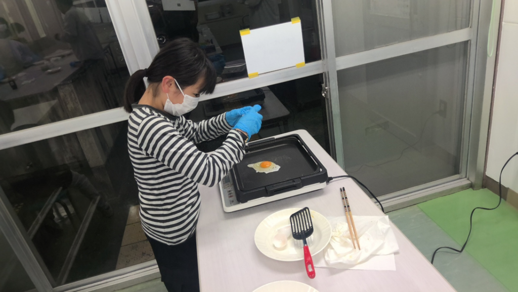 まず、卵を割ってホットプレートに落とします。