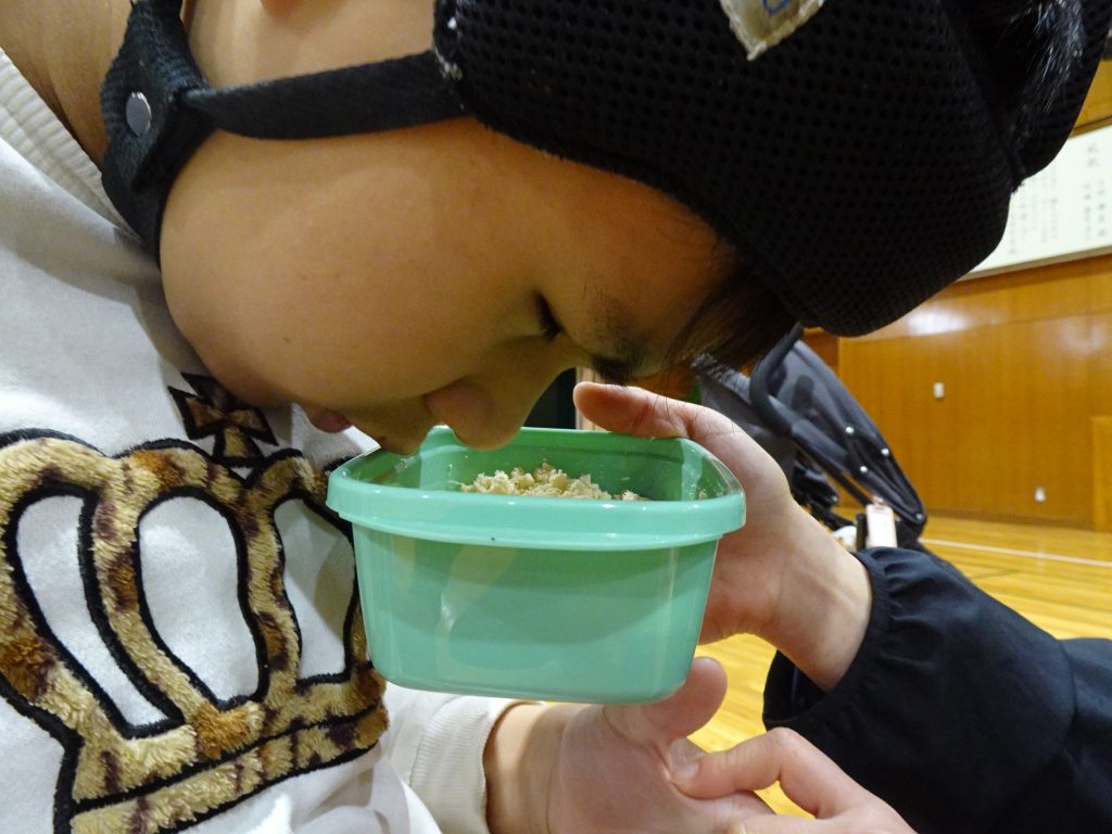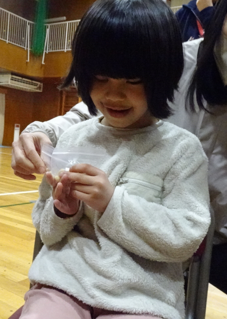 まずは、大豆を触ってみました。乾燥してると固いけど、水につけるとやわらかい。納豆みたいな感じ。水につけると大きくなるね。