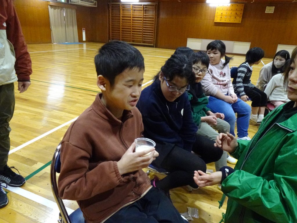 次は、豆乳です。給食では、スープになったり、デザートでプリンででたりしますね。飲んだことあるよ、という声もちらほら。