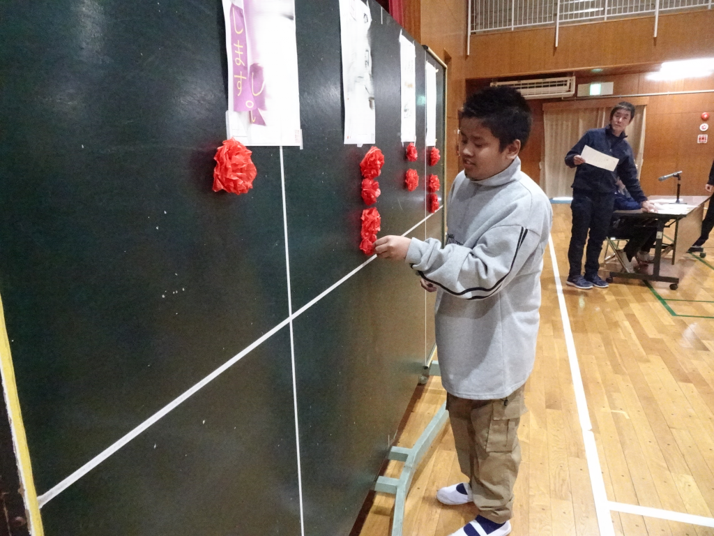 いよいよ開票です。名前を呼ばれた候補者のポスターの下に、選挙管理委員が、花をつけていきます。
