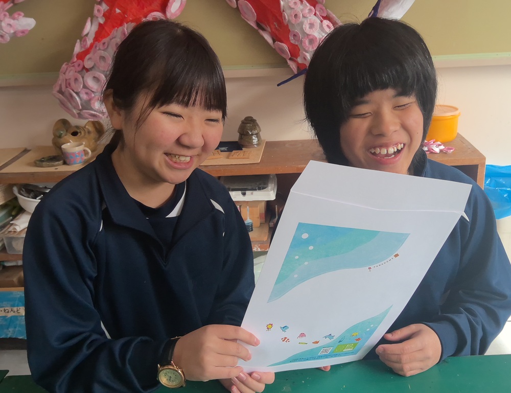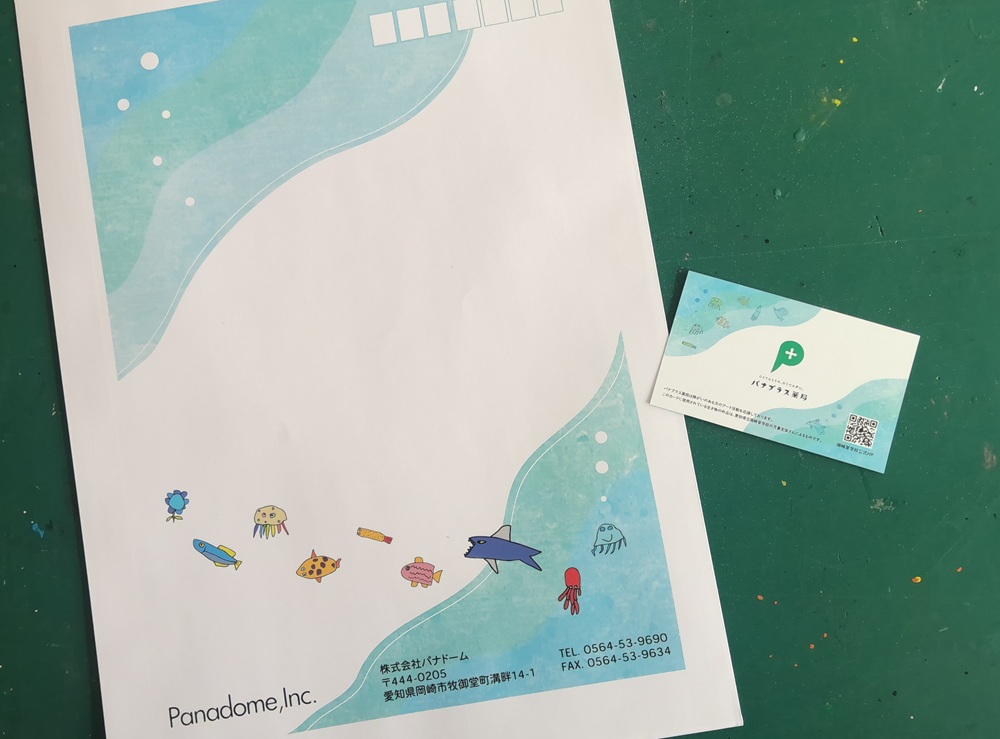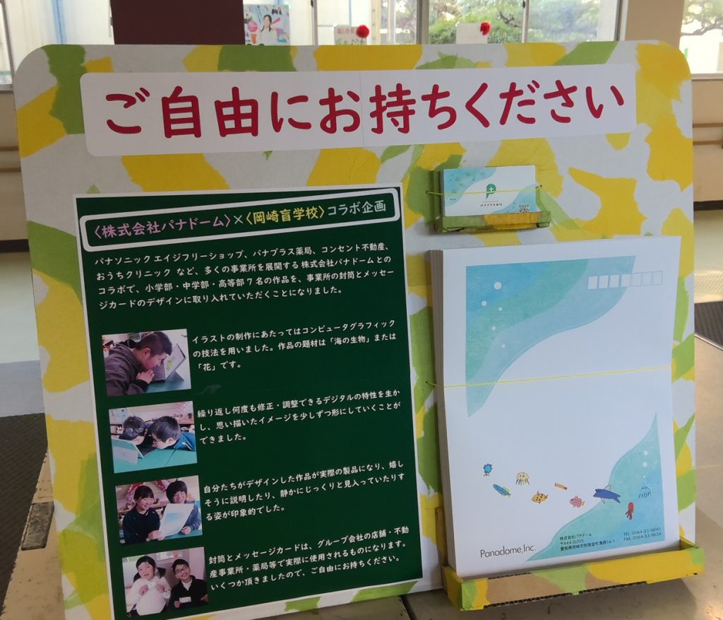 パナソニックエイジフリーショップ、パナプラス薬局、コンセント不動産、おうちクリニックなど、多くの事業所を展開する「株式会社パナドーム」とのコラボで、小学部・中学部・高等部7名の作品を、事業所の封筒とメッセージカードのデザインに取り入れていただくことになりました。